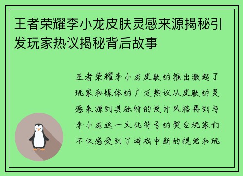 王者荣耀李小龙皮肤灵感来源揭秘引发玩家热议揭秘背后故事