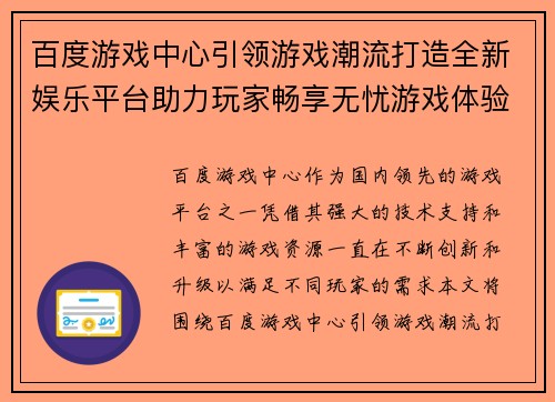 百度游戏中心引领游戏潮流打造全新娱乐平台助力玩家畅享无忧游戏体验